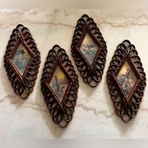 Set of four vintage woven wall art pieces. Features intricate designs with rustic scenes. Perfect for adding a touch of elegance to any room.