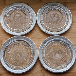 Beautiful Vintage Set Of 4 Sterling Silver Crystal Glass Sunburst Design Drink Coasters Plate Plates #1 (all marked "STERLING sTc" on sterling silver top). Each coaster is about 4" in diameter and about 3/4" tall and is in vintage used pre-owned condition.