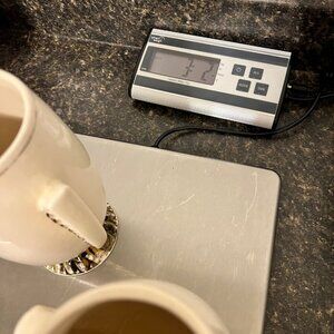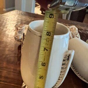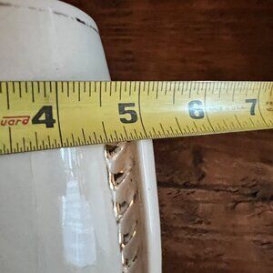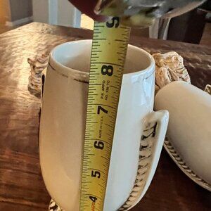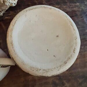 These vintage Art Deco ceramic vases feature gilded accents. Standing at 8 inches tall, they are ideal for showcasing flowers or serving as decorative pieces on their own.The classic design complements a variety of interior styles.