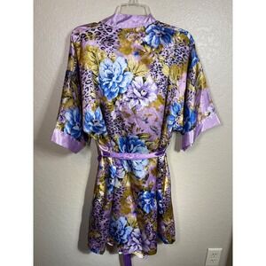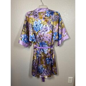 Keywords: robe, slip dress, loungewear, floral print, leopard print, purple robe, kimono robe, nightgown, sleepwear, vintage inspired, lingerie, satin robe, sante classics