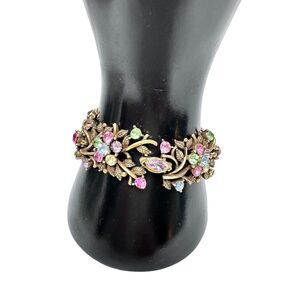 Vintage Set Signed CORO Bracelet 7" & Earrings Antique Gold Tone Rhinestones