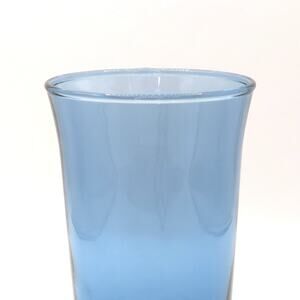 This set of vintage mid-century modern style tumblers is by Libbey. The 12-ounce Bolero glasses are a smoky blue color and feature a slightly flared lip.