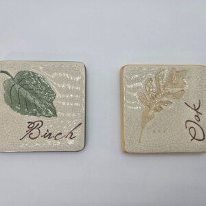 Vintage Set of 2 Ceramic Birch & Oak Leaf Coasters Tiles