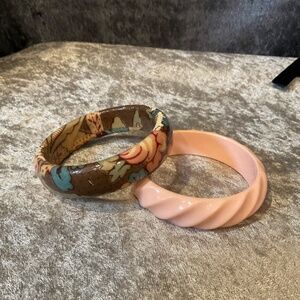Vintage Set of 2 Pink and Floral Bangle Bracelets. Pink swirl bracelet is plastic with a twisted design. 2-3/4" in diameter and 3/4" width. Brown and pink floral bracelet looks like decoupage over a base. There is some wear along rim where it banged against another bangle. Not noticeable when the bracelets are stacked. 2-3/4" diameter and 5/8" width. I love bundles and reasonable offers. Bundling 2+ saves you 10% at checkout plus you only pay one shipping fee! Just send me an offer for 10% less than the total and I will accept it! Most items are listed on multiple platforms, so if you see something that you like, get it while it is still available! Feel free to ask any question and will get back with you as soon as I can. Item #6921