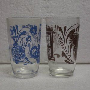 This set of two antique pattern of swanky swig juice glasses comes in brown and blue. No chips or cracks were noted in the glasses some light surface scratches are possible though none were noted. These glasses hold about 4 ounces of your beverage of choice. Great collectors pieces from the 1950's from the Kraft company who put product in the reusable glasses. Please see images for more detail on the glasses.