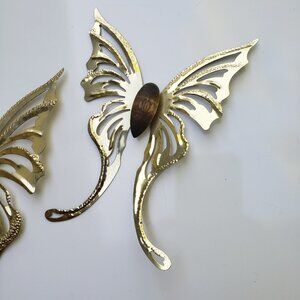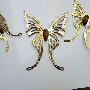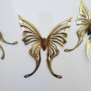Mid century Home Interiors with brass butterflies, set of 3. Crafted with intricate details, these butterflies have wood bodies and brass colored wings. Brass is light weight and bend easily. (Similar to a soda pop can)