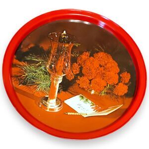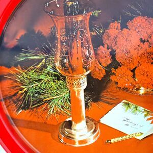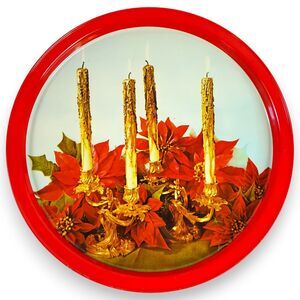 Here is a charming set of three vintage tin trays, perfect for holiday entertaining or display. The vibrant, mid-century graphics are a wonderful throwback to classic Christmas decor. While the trays are unmarked, the design and quality are characteristic of the Atlantic Can Company pieces. The set includes two matching trays with a gold candelabra design and one tray featuring a single candle with a "Holiday Greetings" note.