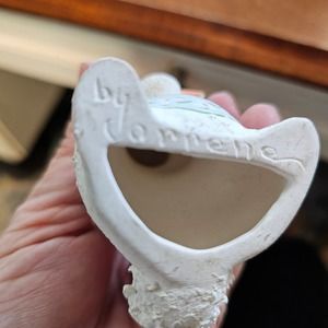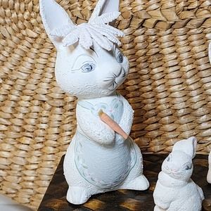 Vintage Set of 3 Hand Painted Ceramic Bunny Rabbit Family Figurines - Easter. These are so stinkin' cute. The detail of the hand painting is just beautiful. With their rough texture on the white parts, they feel like snow babies. Hats and flowers are fabric and stiff.