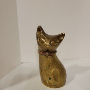 Vintage Set of 3 Whimsical Hollow Brass Cat Figurines Statues. The shortest one is stamped India on the bottom. The other two have no manufacturing information on them. All are hollow inside. The small one has some verdigris spots. The middle size one does not sit quite flat. The tallest one has something inside that rattles. I have not polished them as some collectors prefer them aged. Photos are an important part of the description.