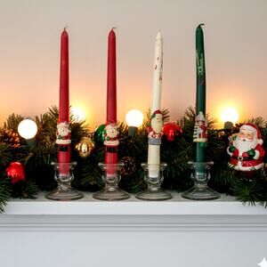 Display these candles in brass or ceramic holiday candleholders surrounded by pine sprigs, ornaments, or a small Santa figurine for a cozy mid-century holiday vignette.