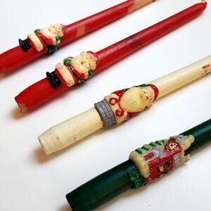 Bring retro Christmas charm to your holiday table or mantle with this set of four vintage molded taper candles featuring jolly Santa Claus and a cozy snow-covered house. Each candle has its own unique design and festive color — perfect for collectors or anyone who loves mid-century Christmas nostalgia.