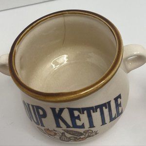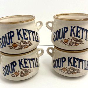 Your soup night just got a little cozier. This 4 piece set of vintage mini crocks are perfect addition to your Serve ware collection. Each holds roughly 16 oz/2 cups of liquid, perfect stew size!!. Cream ceramic base with brown trim detailing, "SOUP KETTLE" in navy blue print with harvest vegetables below.