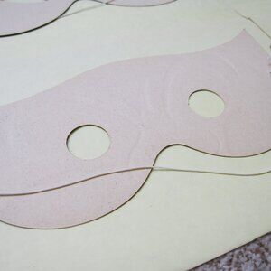 Neat set of 5 colorful masks! Intense, bright colors and designs, each one is unique. Each mask also has slight embossing, which is more visible from the back. They each come with a light yellow backer in a clear plastic bag. No markings, and I'm guessing these are from the 1980s. Very cool, I've never seen anything like them! A carnival, masquerade feeling about these, a bit surreal and Dali-esque. Approximate dimensions (average): 7" wide x 10" overall height x 3" projection. Yes these are sized for adult human faces. Excellent, unused vintage condition. Please note that these masks are printed on rather thin cardstock, and there's a delicate stretch band on each. I feel these masks are a bit delicate - they will not last through a raucous party with eating and drinking. These are best worn for short periods of time, or used in an art project.
