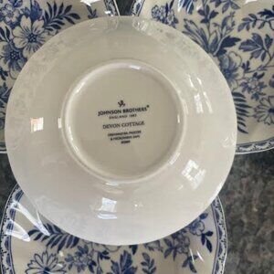 A set of six (6) coupe cereal bowls by Johnson Brothers "Devon Cottage" pattern is a lovely blue floral transferware design on an white ironstone with a slightly swirl shape to the mold of the bowls, with a geometric pattern around the rim.