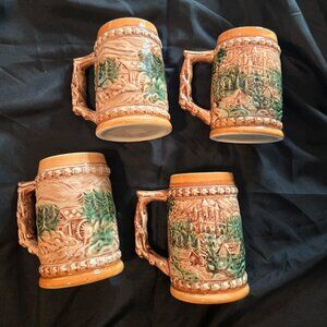 Set of four (4) ceramic porcelain German beer steins impressed, "Japan" on bottom of each. Each stein is in wonderful condition. Each stein features hand-painted relief musical breweriana and village scenes. DIMENSION: 5" tall x 5" wide (including handle) x 4.5" depth. A must for the beer stein collector.
