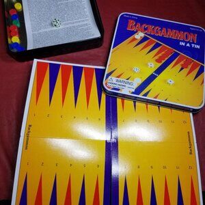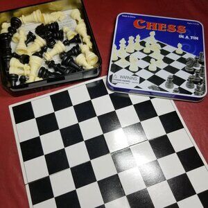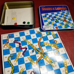 Vintage Set of Four Games in a Tin. Backgammon, Chess, Chinese Checkers, Snakes & Ladders. In good condition. Tins measure 5" x 5". Playing board measures 8" x 8".