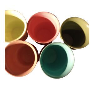 Vintage "1960's" Raffia set. 5 tumblers & 2 bowls. See photo's for colors. In good vintage condition, a couple of melted areas, in otherwise gently used vintage condition, works as should.