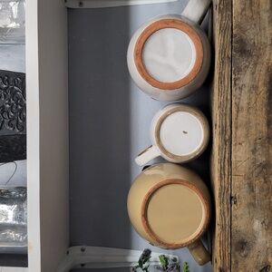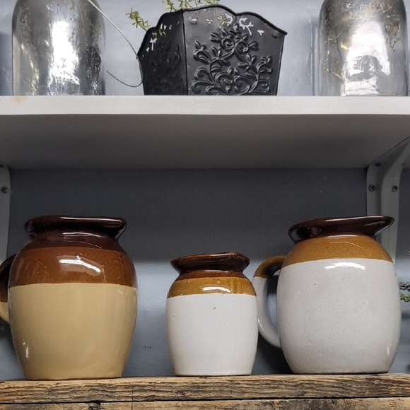 Beautiful set of ceramic jugs with a two-tone design. Features brown and cream colors. Perfect for home decor or kitchen use. Set includes all 3 jugs. Jugs are in great condition