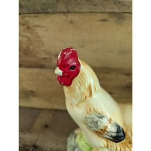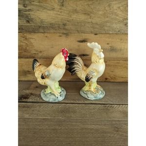 Vintage Set of Two Porcelain Chicken Figurines. Hen and Rooster. Both figures have paint loss on their heads. This seems to be common with red paint on vintage figurines. Can be repainted by the right person with the right paint. These are too nice to just be thrown out.