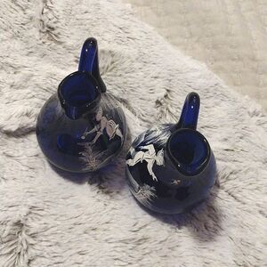 Vintage Set of Two Cobalt Blue Small Mary Gregory Cruets, Ewer Hand Painted Pair