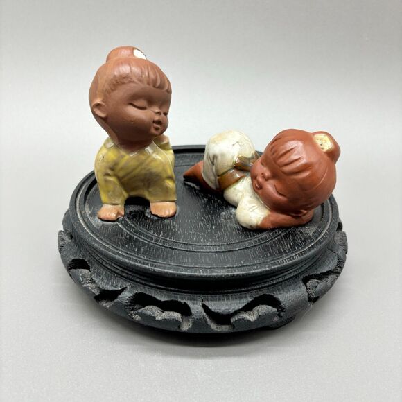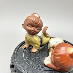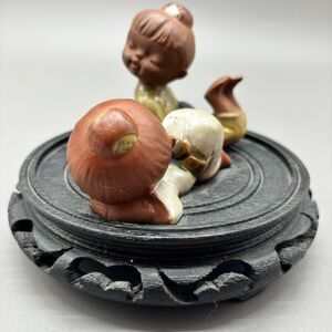Two young Japanese girls in kimonos lying on the floor lounging. They have been attached to a carved black wood base. No chips or cracks. Beautiful mid century decor pieces to add to your collection.