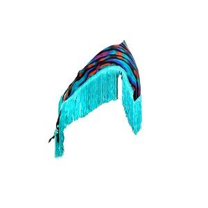 • Features: Turquoise fringe, bead-tipped ties, concho button, bold ikat-style print