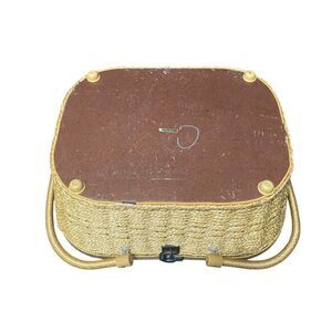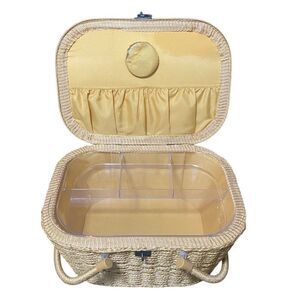 This vintage sewing basket, adorned with a unique retro fabric pattern, serves as a charming storage solution. The woven straw exterior and durable handle offer a nostalgic touch, while the interior plastic insert ensures practical organization for sewing supplies or craft items. Its blend of vintage aesthetics and functionality makes it a cherished addition to any sewing room.