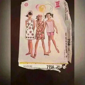 Pullover, sleeveless shift or top, each with round, square or V-shape front neck, and shorts. Shift or top has faced neck and armholes, vents in side seams.