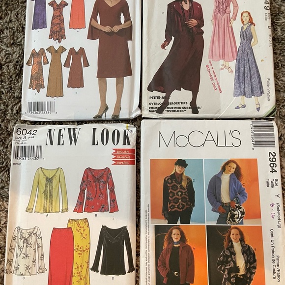 Set of vintage sewing patterns featuring dresses, skirts, and tops. Includes designs in red, black, and blue.