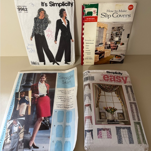 Set of vintage sewing patterns including Simplicity and Singer. Features designs for skirts, slipcovers, and window treatments. Ideal for DIY enthusiasts.
