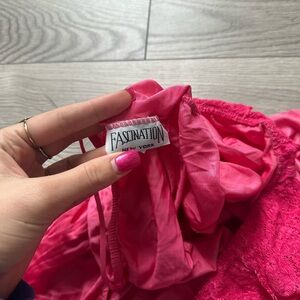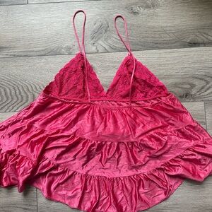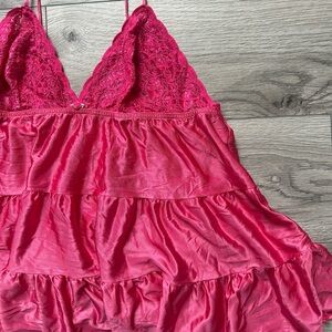 pink lace, see through, ruffle hem, adjustable straps, fairycore, y2k, lingerie-inspired, delicate lace, vibrant pink, sleepwear