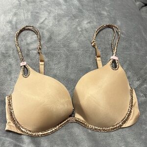This vintage push-up Victoria’s Secret from the collection Sexy Little Things which they no longer make is beautiful. Satin like with leopard outing all over and 2 pink bows on each side. Straps are adjustable and can also be used criss cross. Has a gorgeous VS logo on the middle. Size 32D. Pantie is also satin like with lace around it. Super soft and stretchy. Size Small. Both from the vintage collection.
