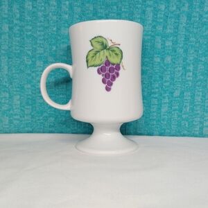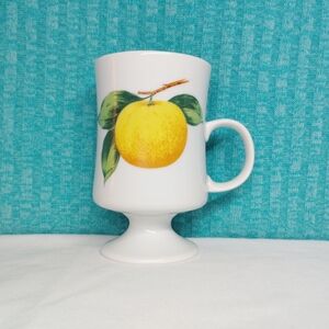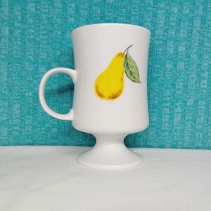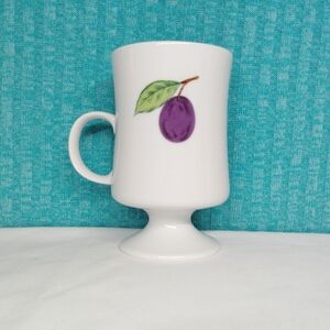 Set of five Vintage white porcelain china footed mugs with wonderfully colorful images of various fruits. In good pre-owned condition without chips or cracks.