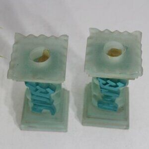 Pair of beautiful vintage Shabbat candlesticks featuring "Shabbat Shalom" inscription. This matched pair of ceremonial candlesticks showcases Art Deco-inspired stepped geometric design in stunning turquoise and jade colors and frosted finish with a protective red felt base.
