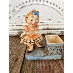 Here for your consideration is a shabby vintage ballerina girl planter. She looks like she is made to look like she has been playing in mud as she has a shabby finish. she does have a little nick on the edge as pictured. The pot measures 2x1.5" and the girl is about 5". Otherwise in good vintage condition.