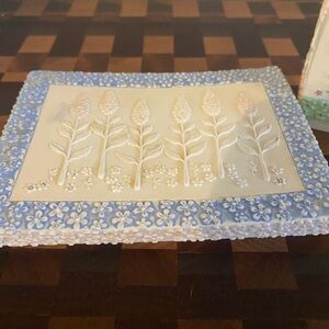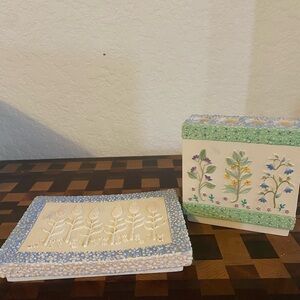 Vintage Ceramic Beautiful decorative toothbrush holder a soap dish with 3D floral embossing. Features cream, green, and blue colors.