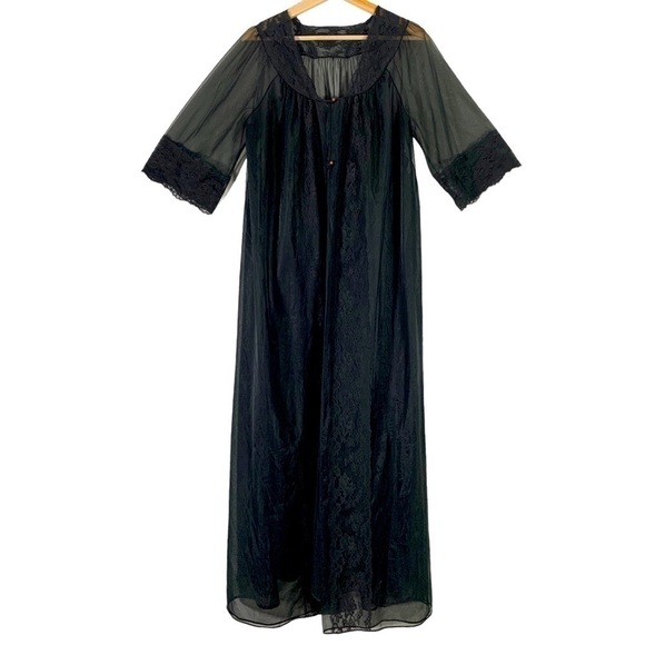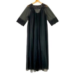 Vintage 1960s Shadow Line Chiffon Peignoir Gown Black Size Medium. Features: Sheer nylon chiffon fabric with lace trim detailing. Long midi length. Double button closure. This is perfect for a little night in. valentines day, or a little cute boudoir photoshoot.