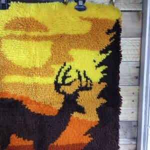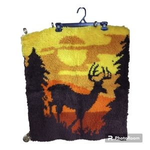 Vintage Shag Hook Latch Rug Deer Forest Sunset Retro 24x27. Cabin rustic country farmhouse Decor. Condition is pre owned, used, good condition.