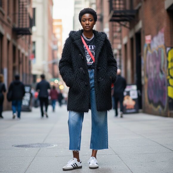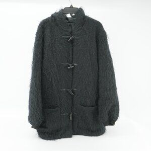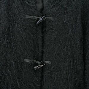 Shaggy Mohair SCOTTISH Wool Embrace cozy vintage style with this black fuzzy duffle coat. Beautifully hand woven sweater with shaggy real mohair and satin lining. Warm with fitted knit at the sleeve to keep the chill out. and a lovely hood. Featuring classic toggle closures and a warm hood, this jacket is perfect for chilly winter days. Its soft texture and timeless design make it a versatile addition to any wardrobe. Ideal for casual outings and staying warm in style. Brand and size not specified, please refer to measurements.