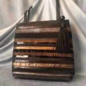 Patterned vintage Sharif purse in excellent condition. Very little use, stored in original dust bag with original store "packing" inside. Back side has zipper pocket, inside zipper pocket and 2 deep sections. Bag is approx 10"x10", handles are approx 14.5" long from top to purse