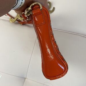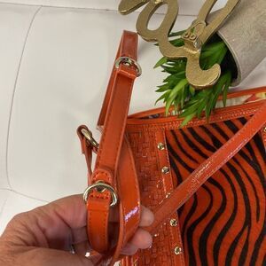 Gorgeous fall orange patent leather bag in excellent condition. Features zebra cowhide panel with gold hardware and woven leather detailing. Fully lined patterned super clean interior. Interior zippered storage. Small spot of wear on one bottom corner see pics. Smoke free home. Bundle and save! Check out my love notes!
