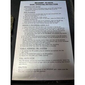 The Sharp RD-680V Professional Series Cassette Recorder offers reliable recording capabilities with a condenser microphone and full auto-stop feature. It includes input options for line-in and microphone connections, ensuring versatility in use.