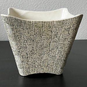 A stunning midcentury planter from Shawnee Pottery's Elegance line! The exterior has a basketweave pattern, in an off-white glaze with a silver speckle overlay. Gently curved top rim, slightly wider at the top than the bottom. Measures 6" tall and 5.5" across at the top.