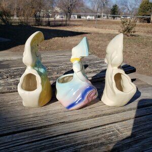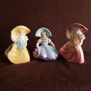 Set of three planters, blue, pink and yellow southern belle dancers. Largest is 4x5x3". Good condition, the blue one has chip on bottom. See pictures.