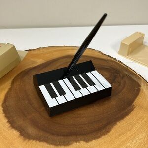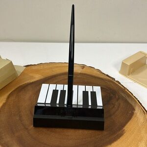 Sheaffer desk set featuring a ballpoint pen, blue ink and piano keys base. Elegant black and cream design. New in box, although due to age box has some tape on it. Set does not appear to have been used. Vintage set from either the 70s or 80s. No extra ink refills included.
