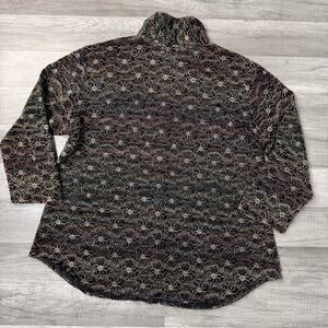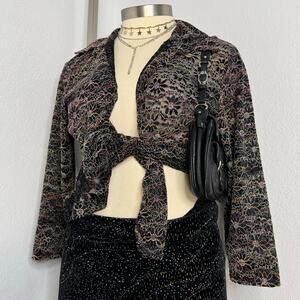 Vintage Chico’s Design sheer black lace blouse with allover multicolor embroidered floral pattern, 3/4 sleeves. Versatile styling — wear it buttoned up, tied in front, or layered over slip dresses. Whimsical and bold — perfect for whimsigoth, maximalist, or romantic dark academia. Size 3 / XL