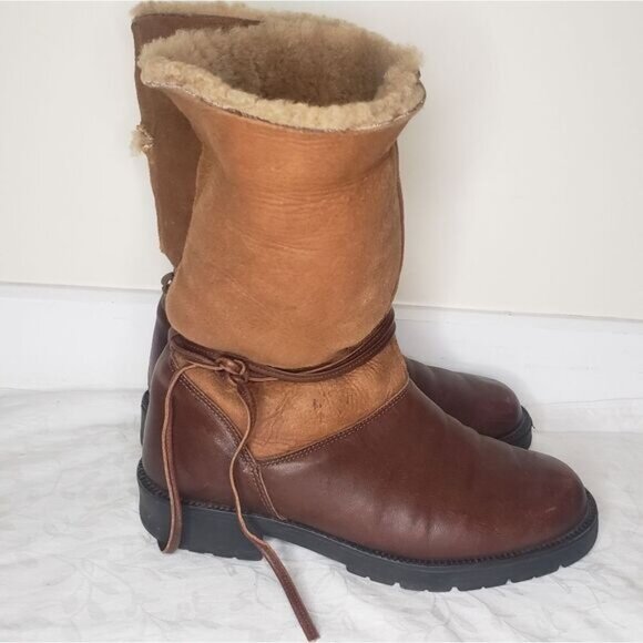 Soft Tan Sheepskin Suede dark Brown Leather Shearling lined Moto style Boots with leather tie straps and rubber nonslip soles, by Santana Canada.
