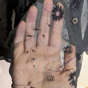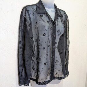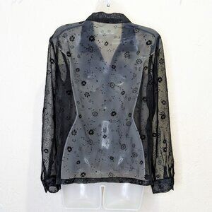 Vintage Sheer Black Embroidered Blouse Flocked Velvet Dark Romantic Boho Button Down