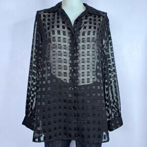 Vintage Sheer Black Grid Blouse Mesh Button Up Y2K Grunge Officecore Large