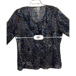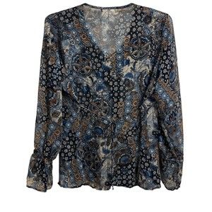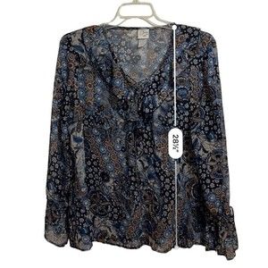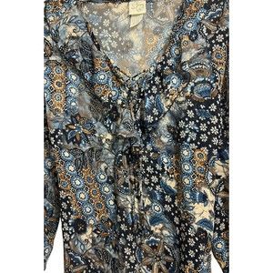 Size Large Pre-Loved Condition This blouse ties in the back and also front at the neckline for a custom fit and a flowing look.